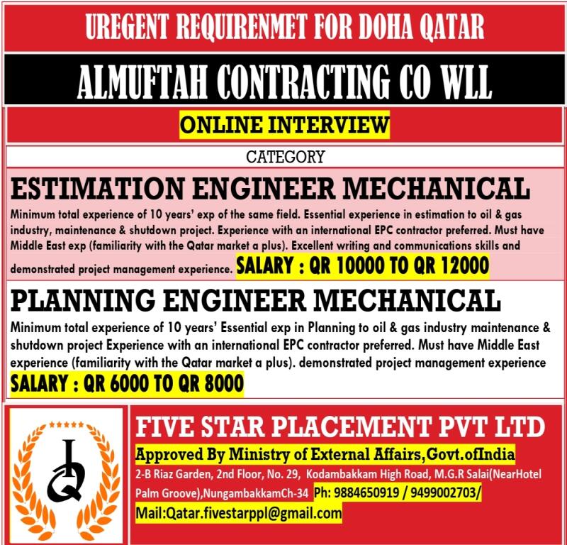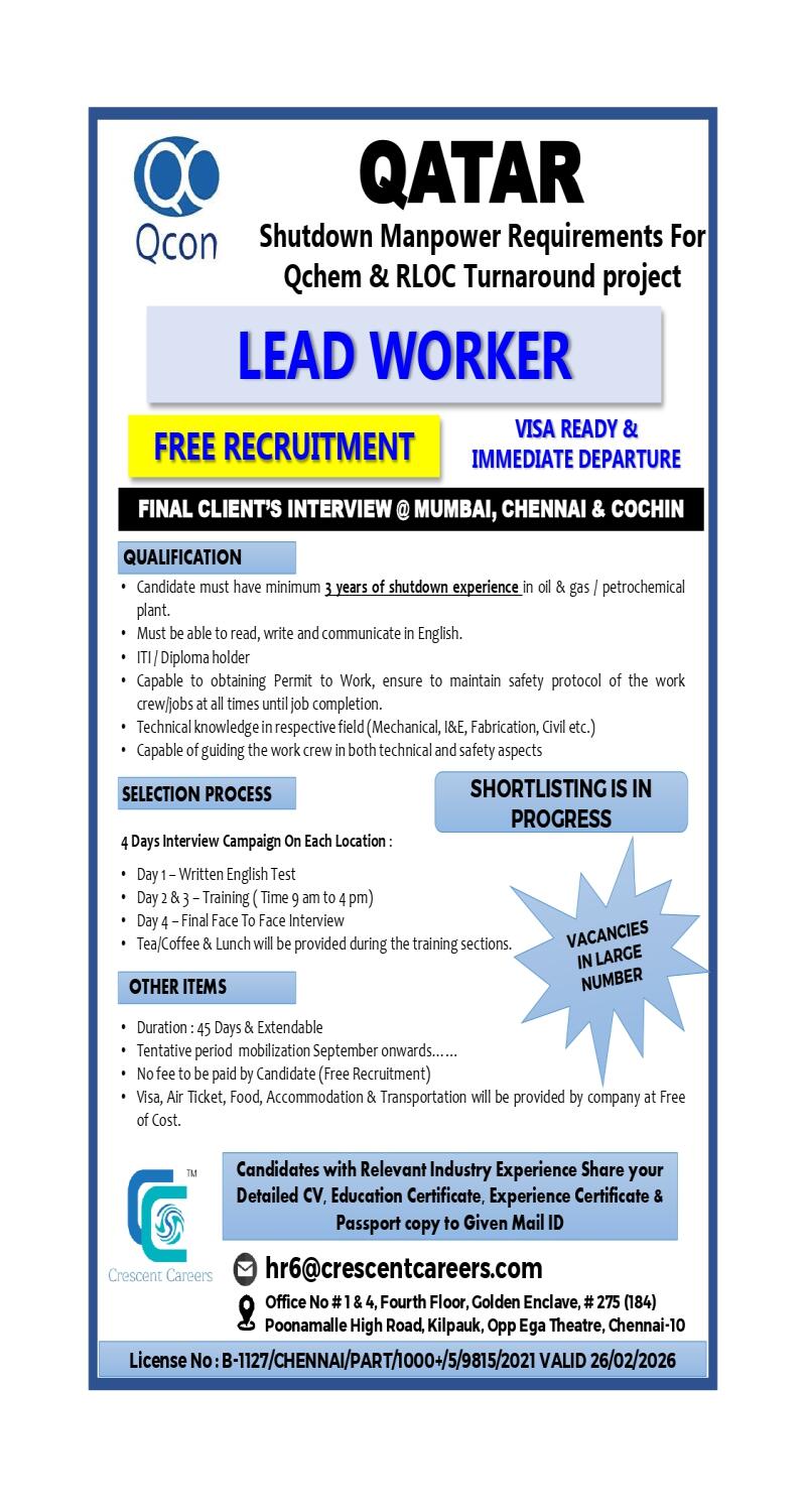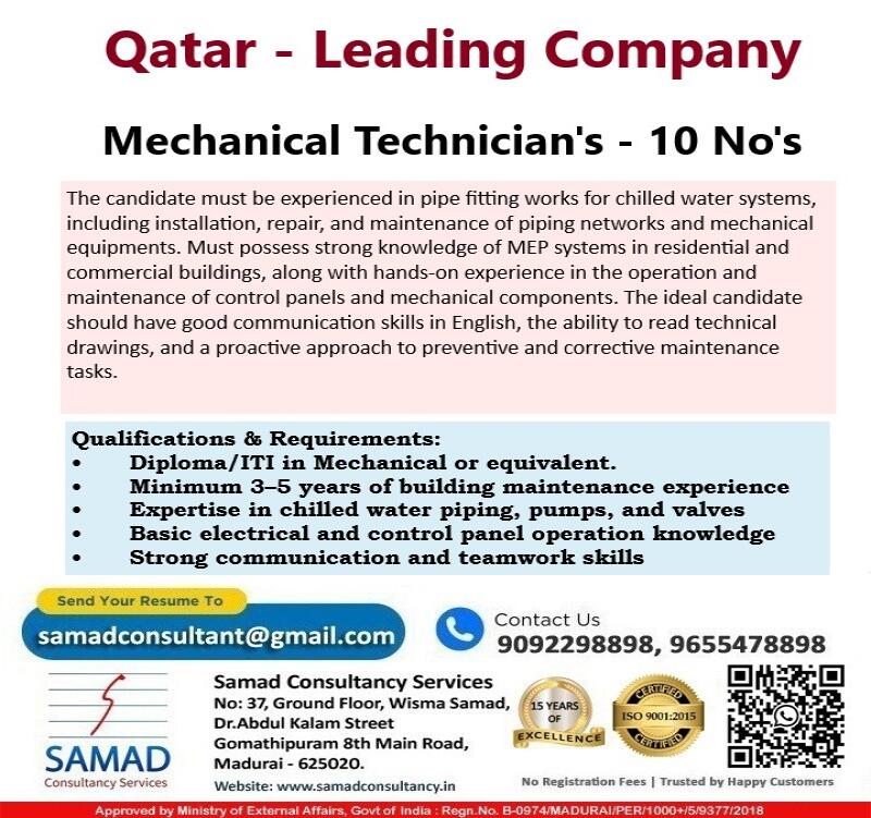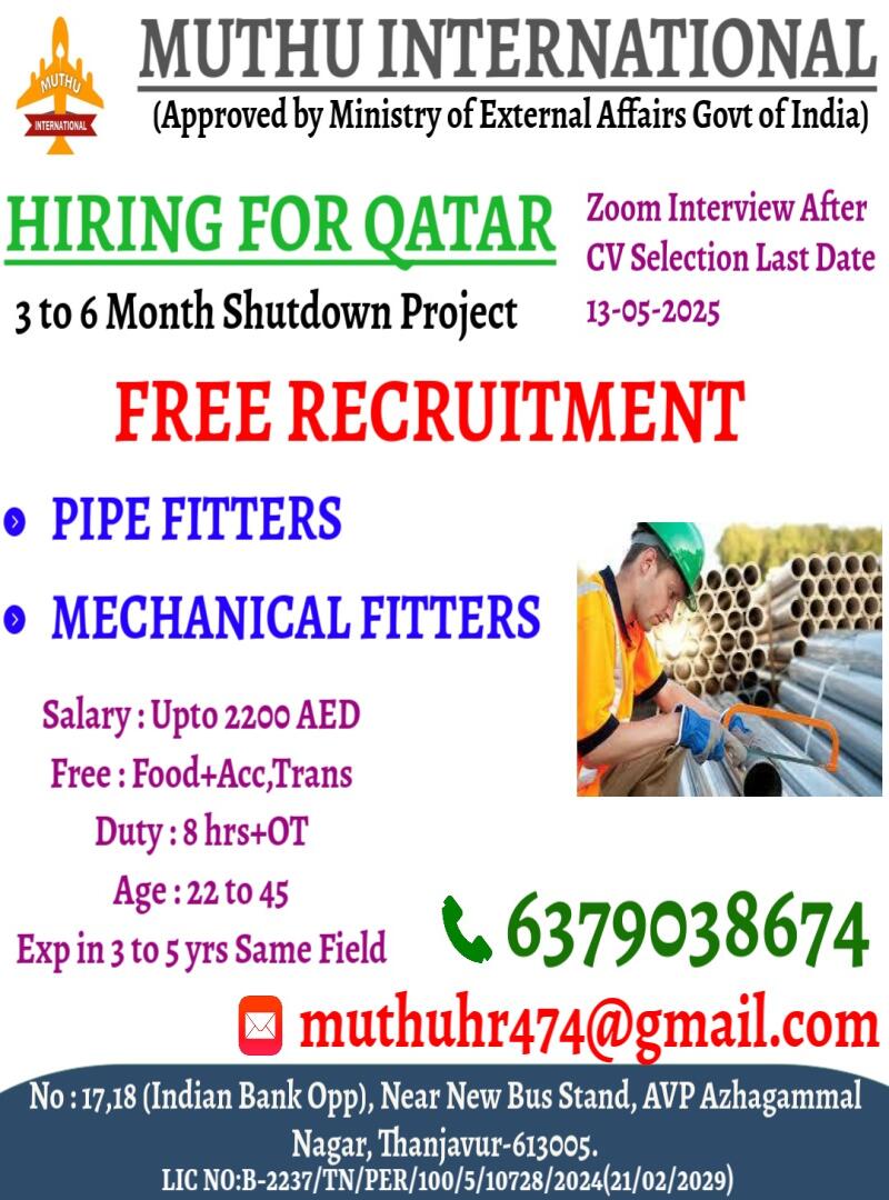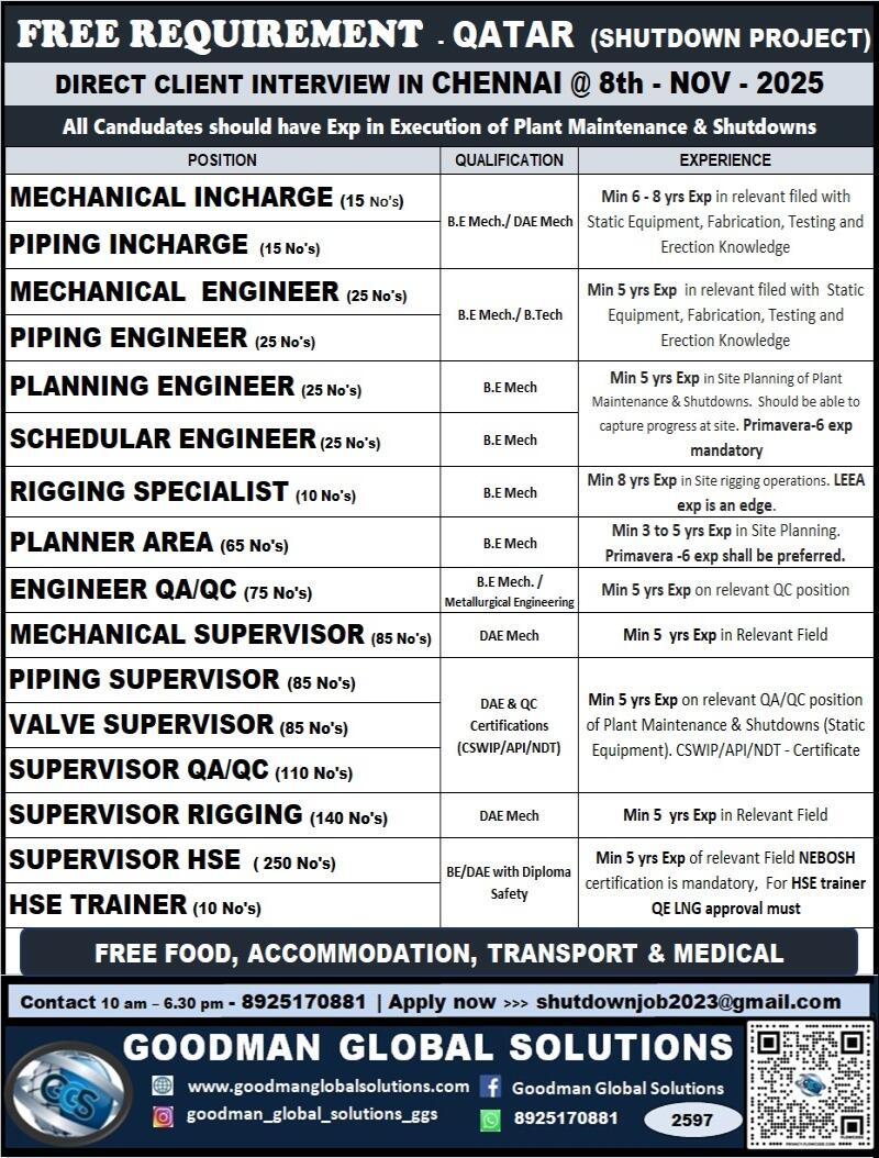 FREE REQUIREMENT - QATAR - SHUT DOWN PROJECT DIRECT CLIENT INTERVIEW IN CHENNAI @08-NOV-2025 Candidates should have Exp in Exceution of Plant maintenance & Shutdown To Apply CONTACT - 8925170881 MAIL ID : shutdownjob2023@gmail.com 180 - 250 QR Per Day FREE FOOD, Transport, Accommodation, Medical Kindly join and follow the below links for Daily Gulf Job Updates @ WHATSAPP GROUP :https://chat.whatsapp.com/DlB78WqeRrrE2H2PN6IvHQ?mode=ac_t @ WHATSAPP CHANNEL : https://whatsapp.com/channel/0029Va4euefATRSutiAXU60i @ INSTAGRAM : https://www.instagram.com/goodman_global_solutions_ggs/ @ FACEBOOK : https://www.facebook.com/profile.php?id=100094017957915