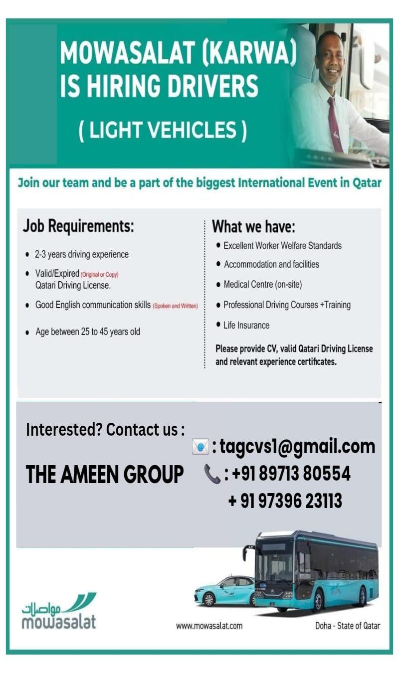 Urgent Requirement – Light Vehicle Drivers for Mowasalat (Karwa), Qatar