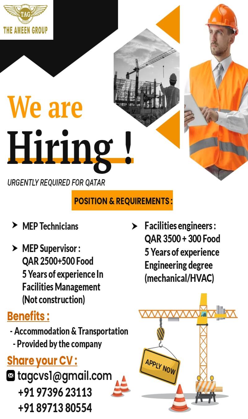 Urgently Required – MEP Technicians | MEP Supervisor | Facilities Engineers – Qatar