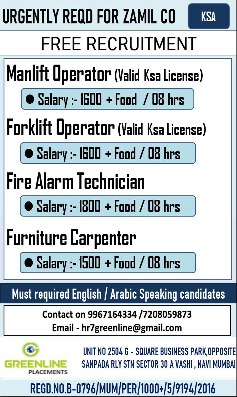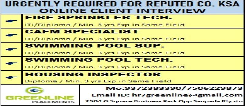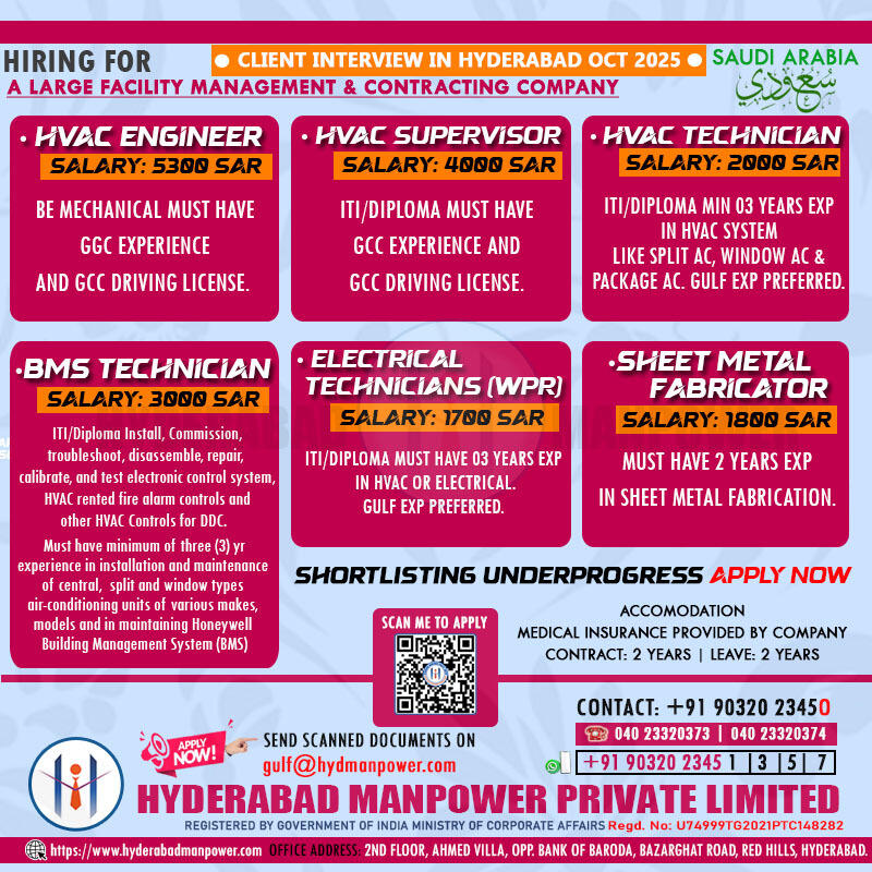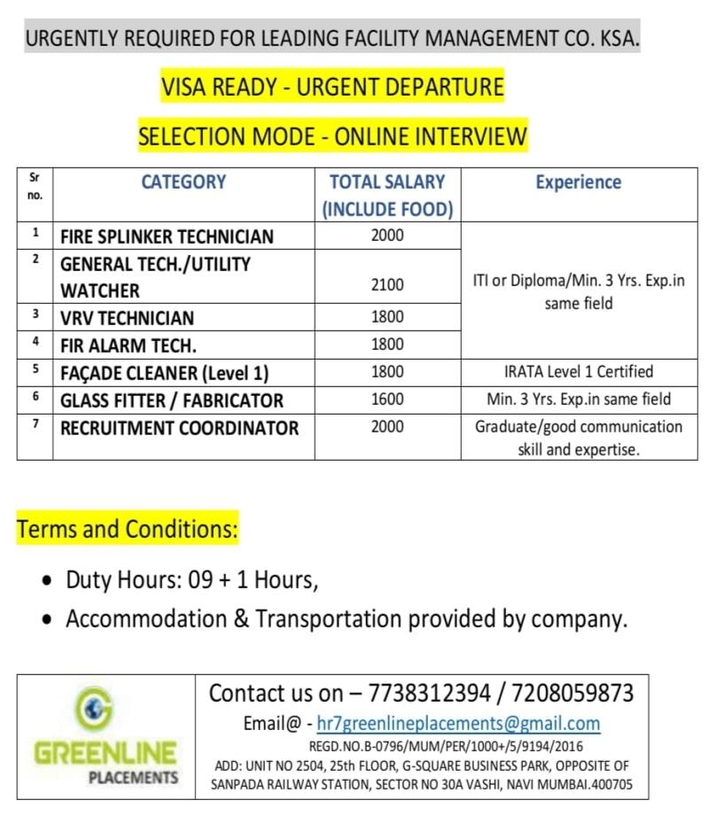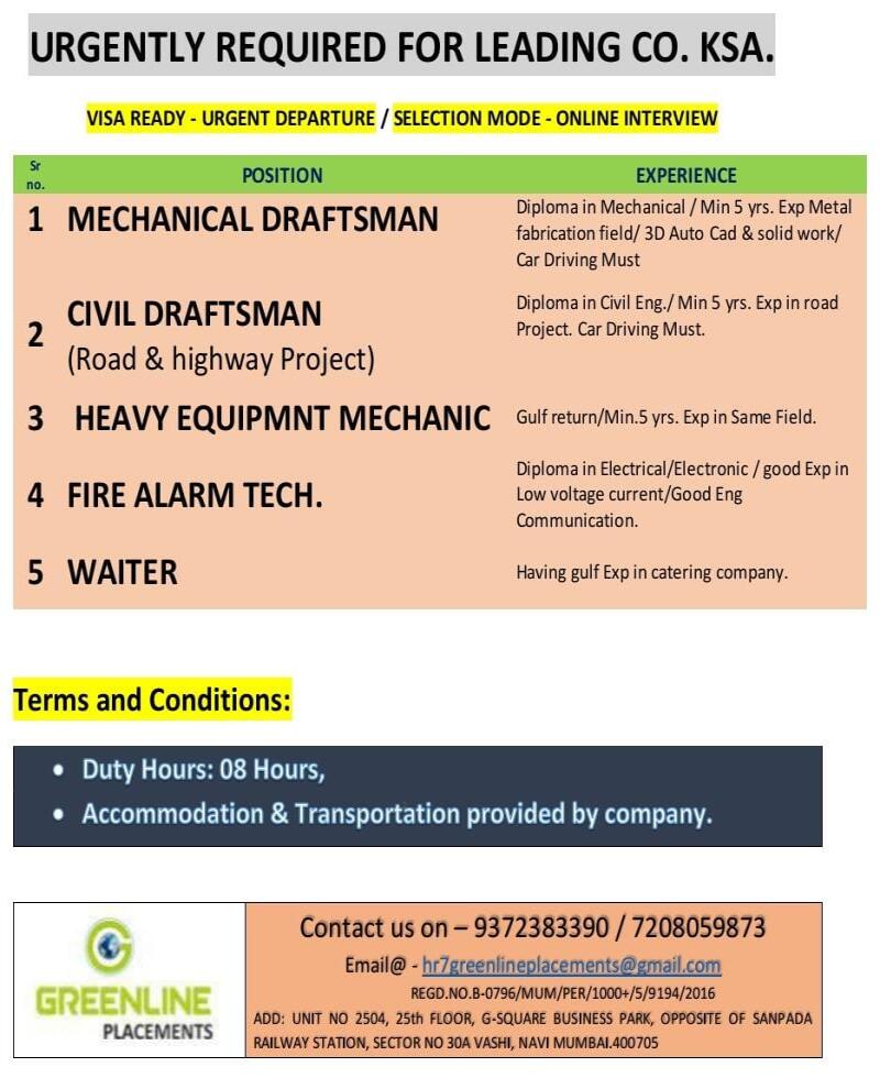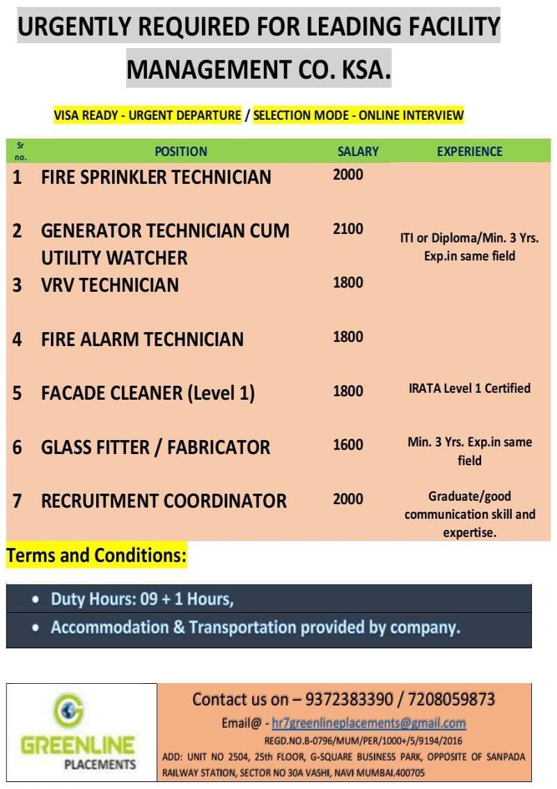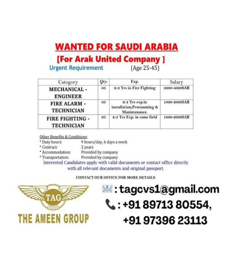 Urgent Requirement for Saudi Arabia – Mechanical Engineer, Fire Alarm Technician, Fire Fighting Technician.