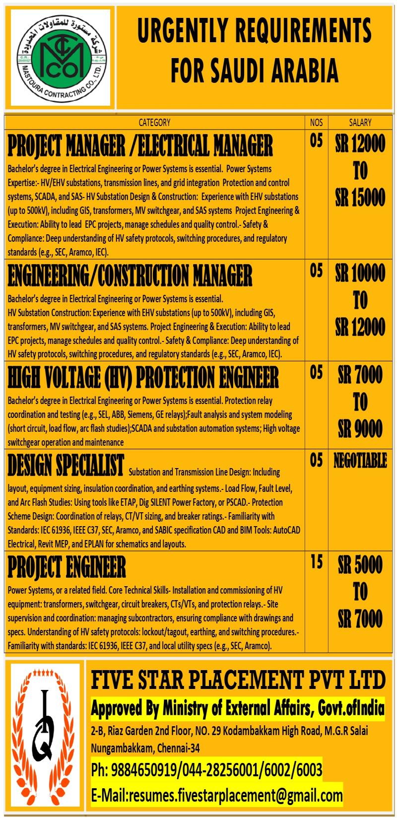 URGENTLY REQUIRED FOR REPUTED CONSTRUCTION COMPANY (SAUDI ARABIA)